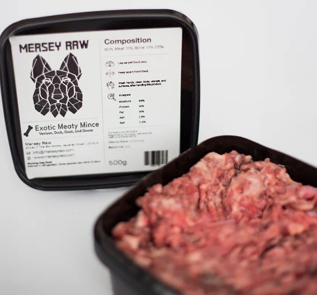 This EXOTIC meaty mince contains: Venison, Duck, Goat and Goose
