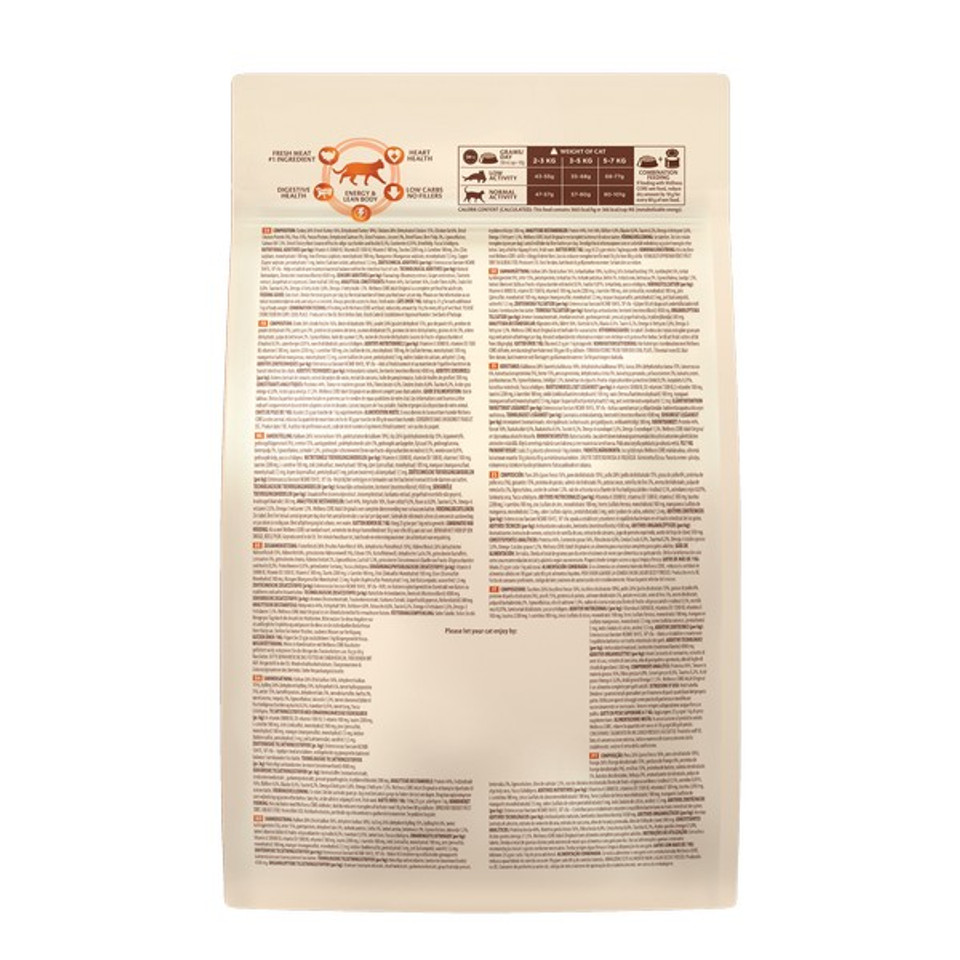 Turkey (26%) (incl. fresh turkey (16%), dehydrated turkey (10%)), chicken (26%) (dehydrated chicken (15%), chicken fat (6%), dried chicken protein (5%)), peas (15%), potato protein, dehydrated salmon (5%), dried potatoes, linseed (3%), dried flavour, beet pulp (2%), lignocellulose, salmon oil (1.5%), dried chicory root (source of fructo-oligo-saccharides and inulin) (0.5%), cranberries (0.01%), dried kelp, yucca schidigera, mixed herbs (dried rosemary, dried turmeric, dried citrus, dried eugenia).